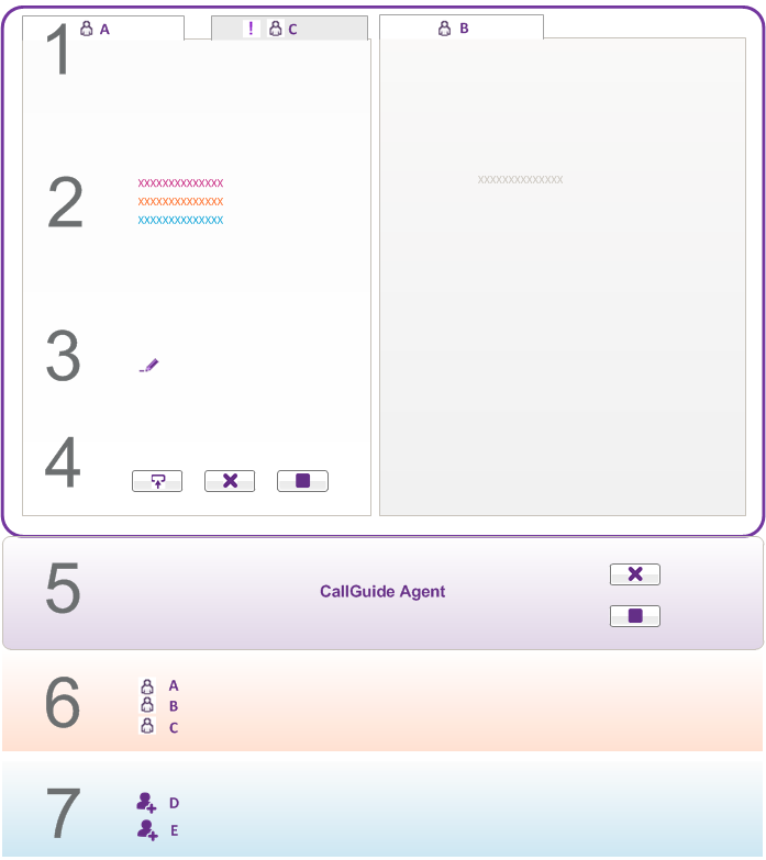 På den här skissen är chattfönstret placerat ovanför huvudfönstret i ACE Agent, med två chattområden enligt den valda klientinställningen, och tre accepterade chattar.