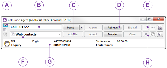 Se Pågående kontakter. Här med både talsvars- och förfrågansamtal. Aktiv part visas med fet stil.
