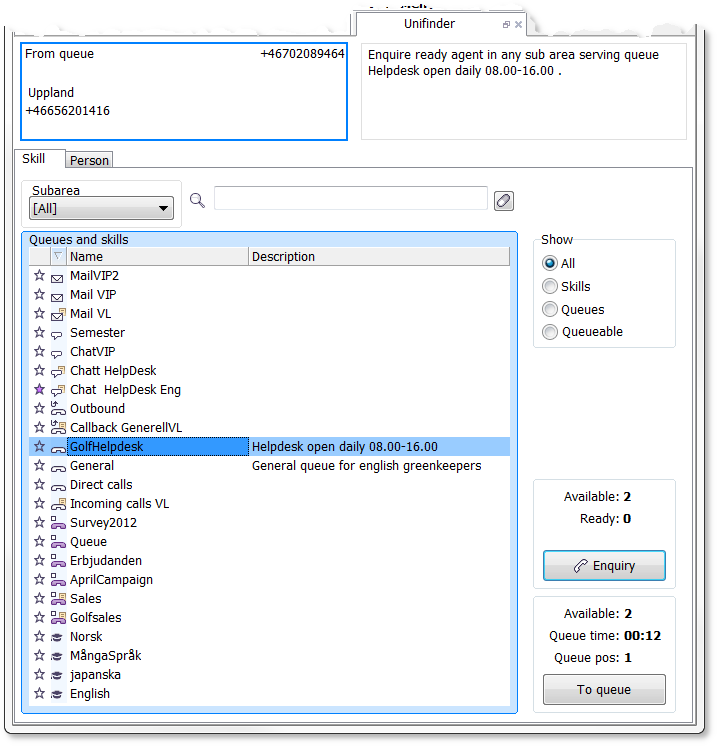 I Unifinder under fliken Kompetens i ACE Agent kan du ringa förfrågansamtal till kollegor med en angiven kompetens, som tillhör ett specifikt delområde eller som betjänar en viss kö. Du kan också placera en kontakt i en vald kö.