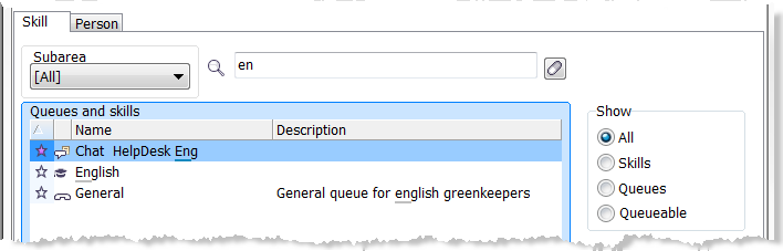 - För att hitta en viss kö eller kompetens skriver du i sökfältet