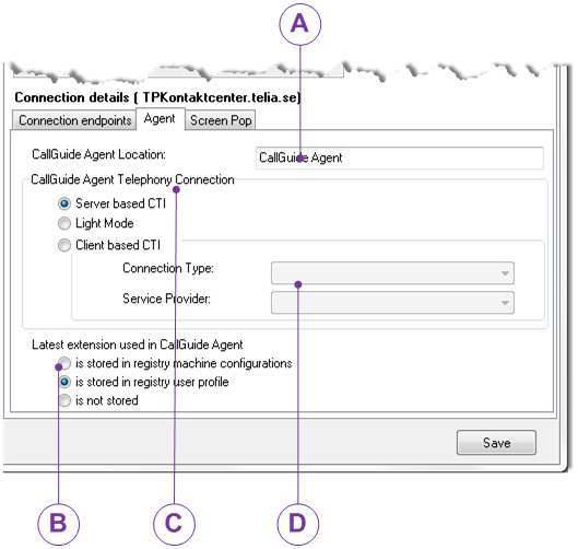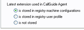 Under Latest extension used in ACE Agent you enter where in the Windows registry to save the latest used extension, if to save it, between logins to ACE Agent. The default choice is save to registry’s user profile. If a user does not have the access rights to write in the machine configuration of the register and/or user profile, the corresponding choices are greyed.