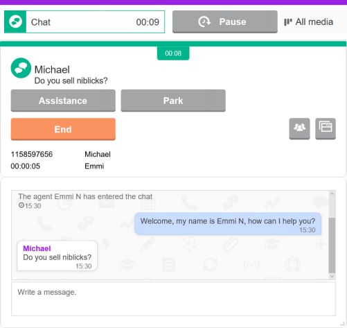 - För att starta chattkonversationen klickar du på Acceptera. Chattar som hämtas från väntelistor godkänns automatiskt. För chattar som distribueras via köer kan du välja att Acceptera kontakter automatiskt i Meny | Klientinställningar.