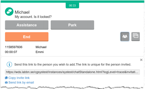 - När deltagaren följer länken i webbläsaren är deltagaren ansluten till den pågående chatten. Det finns specifika standardfraser som visas för alla deltagare eftersom en inbjuden deltagare kan gå in eller lämna chatten. Om chatten är i videoläge kommer den inbjudna deltagaren att erbjudas att ansluta sig till video.