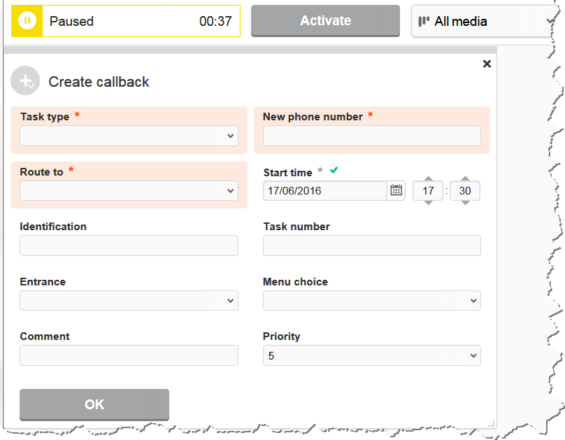 I stödfunktionen Skapa callback lägger du till information om samtalet som ska ringas.