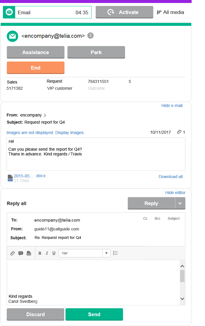 Om en annan agent ska fortsätta hantera kontakten kan du återplacera e-brevet i kö, inklusive eventuellt påbörjad svarstext, genom att använda Assistans för att hitta agenten, följt av Till kö.