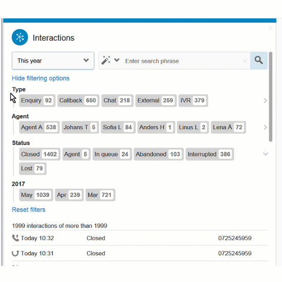 - Om du vill hitta specifika interaktioner i sökresultatet klickar du på de relevanta filterknapparna efter filterkategorierna Typ, Agent, Status och Datum.