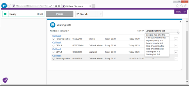 Innehållet i den sammanslagna Väntelistan beror på vilka tjänster och väntelistor du är inloggad på. Vilka uppgifter du kan se konfigureras per mediatyp i ACE Admin, fönstret Waiting lists in ACE Agent. Du kan sortera kontakterna efter t.ex. Realtidsmedia först eller Kortast väntetid först.
