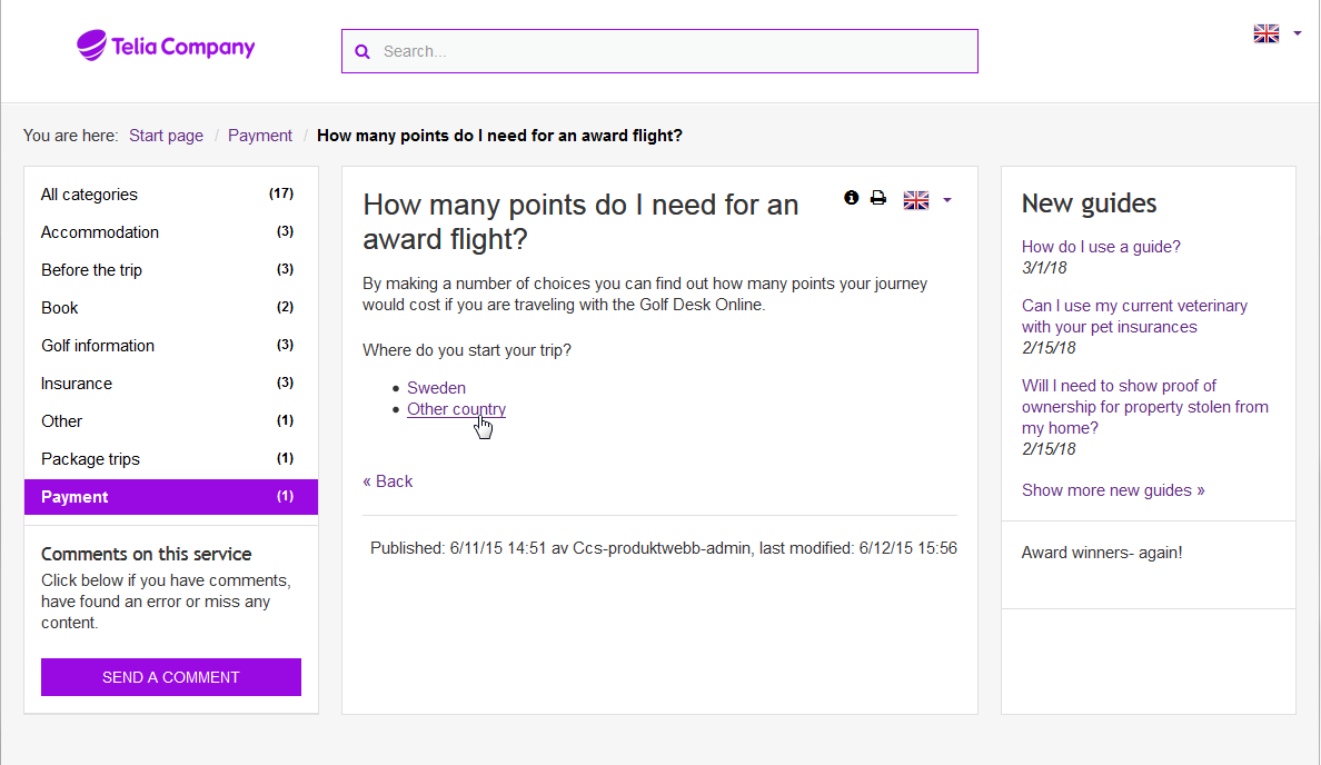 - En lista med guider, d.v.s. frågor med svar, indelade i olika kategorier.
