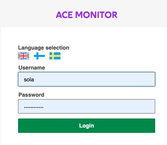 - Logga in genom att välja önskat Språk och ange ditt ACE Användarnamn och Lösenord.