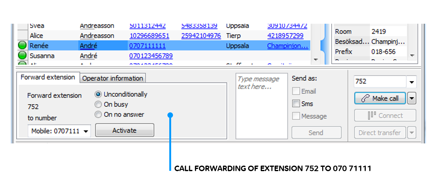 - Allowing the operator to enter a number to (temporarily) forward calls on behalf of a colleague. Useful, for example, if the colleague’s regular phone is out of order or left at home by mistake.