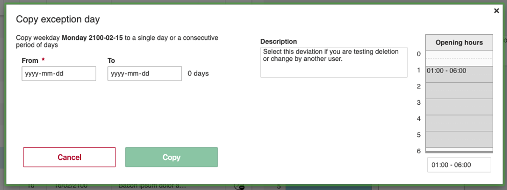 - Copy exception days to easily create new, single or series of consecutive exception days using an existing day as a template.