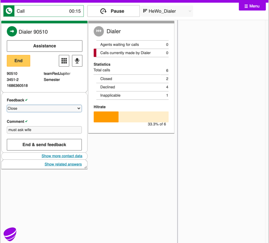 - The agent can choose a campaign for which he/she has the right skills and start taking calls made by the dialer.