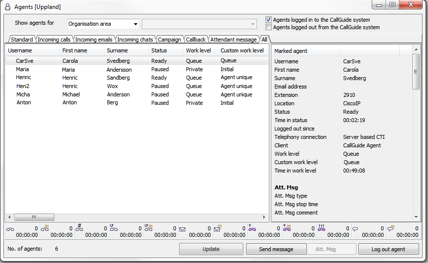 The window is available in View organisation area, View subarea and View my my subareas. That is, if you have selected View my organisation areas you cannot see agent information.