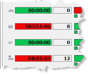 - The background in the Longest queue time box changes colour from green to yellow (which means that one of the service levels is not currently fulfilled) and then to red (which means that none of the service levels are currently fulfilled). The colour shows which service level would apply were the call to be served immediately. If the call has to continue waiting, the colour coding can change to a worse level. The thresholds used are those defined at organisation area level.