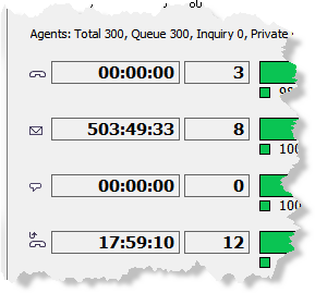 - Total no. of agents (logged in), number of agents Paused, In wrap-up, In contact, In queue, In inquiry, Personal queue, and Ready respectively.