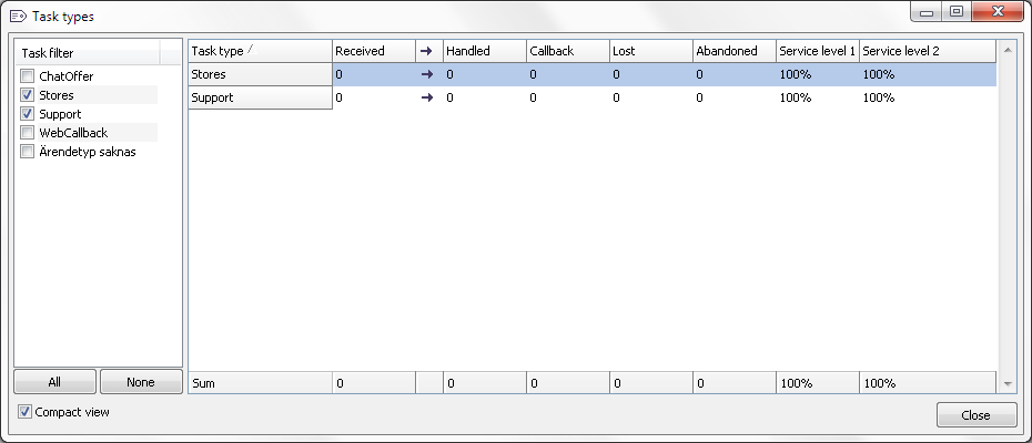 In the left part of the Task types… window, you see a filter part with all the task types you have configured in your ACE solution. This is where you can select the task type(s) for which you want to view real-time information. If you have many task types, it could be quicker to use the buttons at the bottom so select All or None and then select or unselect the task types for which you want to view values.