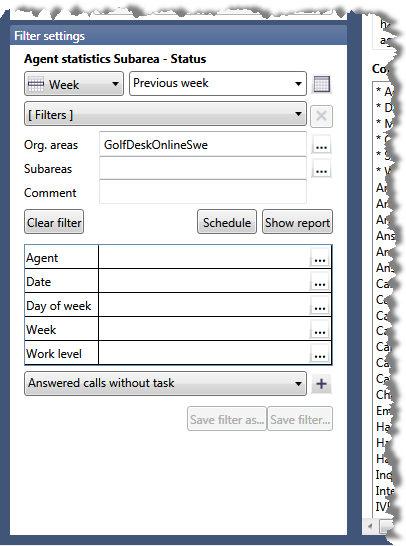 i det här exemplet Agentstatistik Delområde – Status. - Gör sedan följande i Filterinställningar: