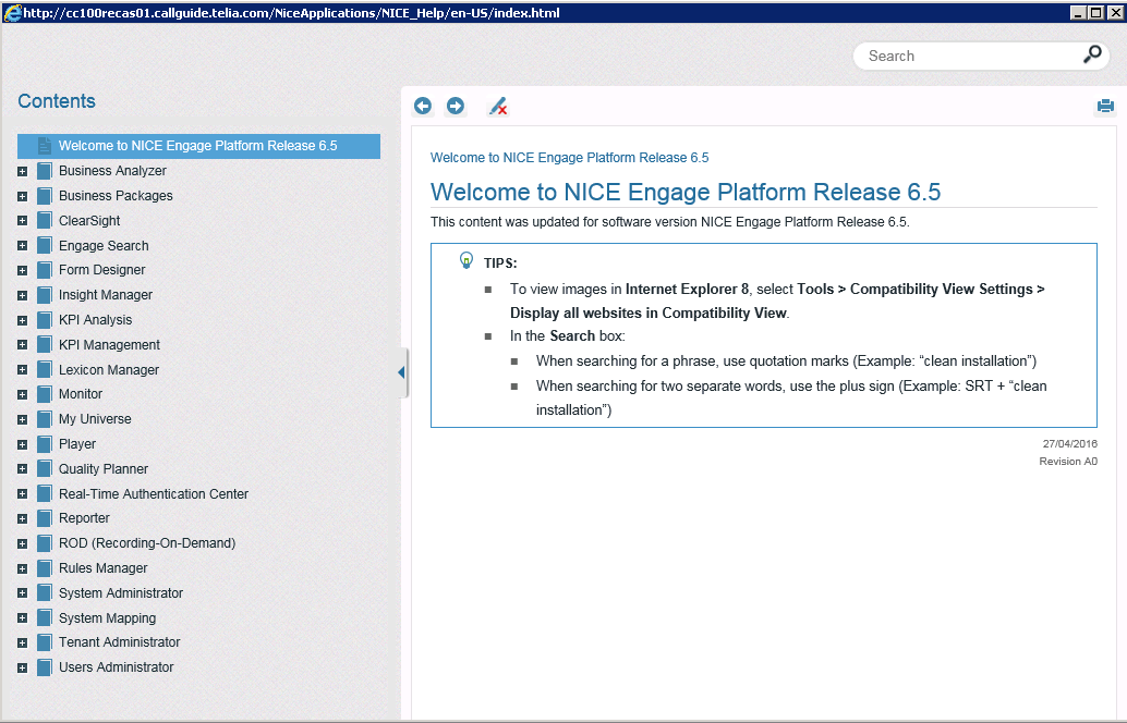This manual text, in addition to other instructions on how to use ACE, is found on the public web site https://docs.ace.teliacompany.com/. For more detailed facts about the NICE Engage® modules included in ACE Recording, you can also use the built-in help features.