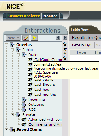 To the left in Business Analyzer | Interactions you see, in a tree structure, ready-made alternatives for search filters. These are public and can be seen by everyone with the privilege to log in to NICE Engage®. You can use the search filters for immediate search but you can also regard them as templates where you can alter the most commonly used selections; date and time, the duration of the call, and agent. You do this in the Quick Query field.