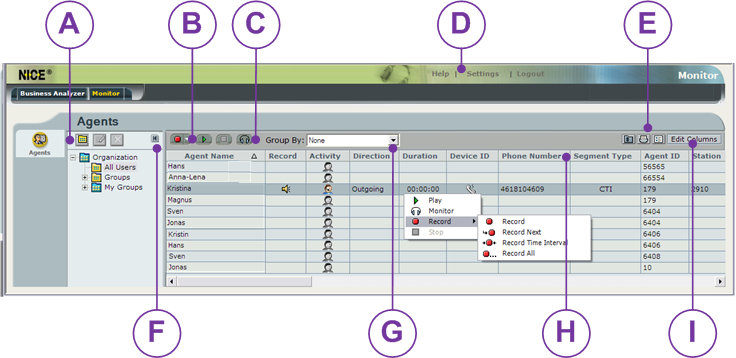 In NICE Engage ®, the Monitor tab, you see agents’ statuses in realtime, you search in various groups, select an agent and monitor his call using the buttons described in the overview picture below. If you, in your ACE Recording, record what is seen on the agents’ computer screens, you can also see the resulting video clipping here.