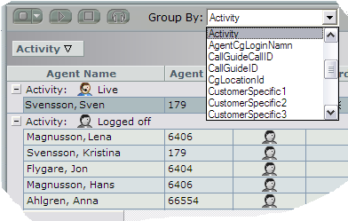 You can choose whether you just want to display the rows with a value in the selected column (Non blanks), only show those without value in the selected column (Blanks), or have a specific value. On the screen-shot example below the filter menu for Activity shows the alternative values Live (call in progress) and Logged in (logged in without a call in progress).