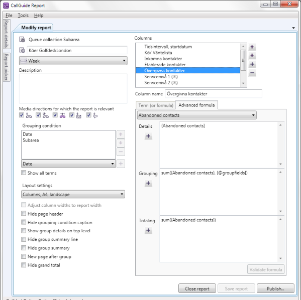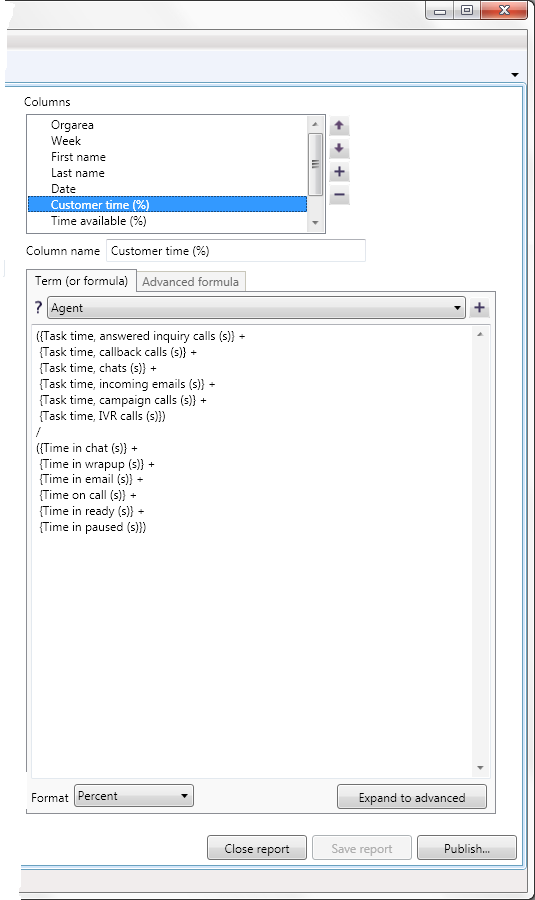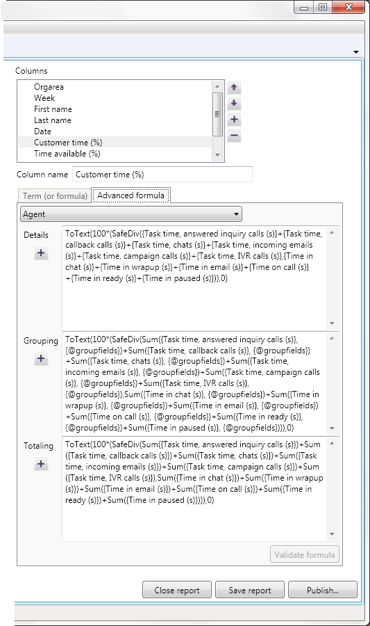 To the right in Modify report a column is selected in the column list. Below it, in the Advanced formula tab, you see the formula for the column, divided into the three presentation ways.