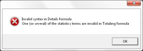 - If a formula is not complete, or contains syntax errors, ACE Report will indicate this by an exclamation mark in the column list and then you see the text field with a