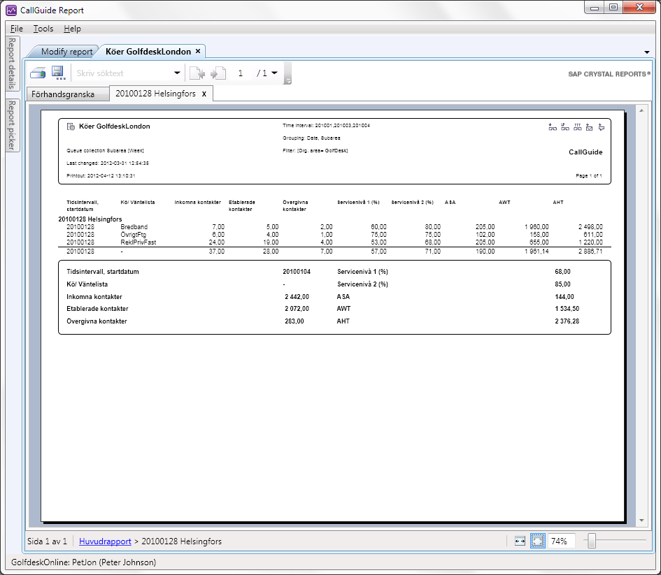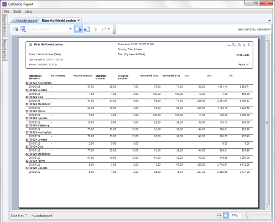 To apply sums and drill-down, a tailored report must be grouped on at least one of the terms that are included in the report's underlying statistical collection. Grouping makes subtotals possible for each unique value in a grouping condition. If you e.g. in a report presenting task statistics for calls, have selected the Task type grouping condition, you see a subtotal for each existing task type and a total for all task types that can be connected to the calls in the customer service.