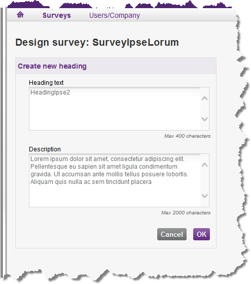 If you choose to add a Heading, a window is opened where you enter your heading text using no more than 400 characters. You can also add a description of a maximum of 2,000 characters.