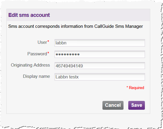 Under the Users/Company menu, Sms accounts tab, click the New sms account button and enter the following data