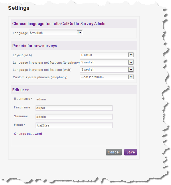 In the drop-down menu you select whether the system messages to be played in telephony surveys, if e.g. there is something wrong, shall be in Swedish, Norwegian, Finnish, English, or Lithuanian. If your surveys e.g. mostly are aimed at Finnish speaking people and you write your questions in Finnish you should choose Finnish here as well.