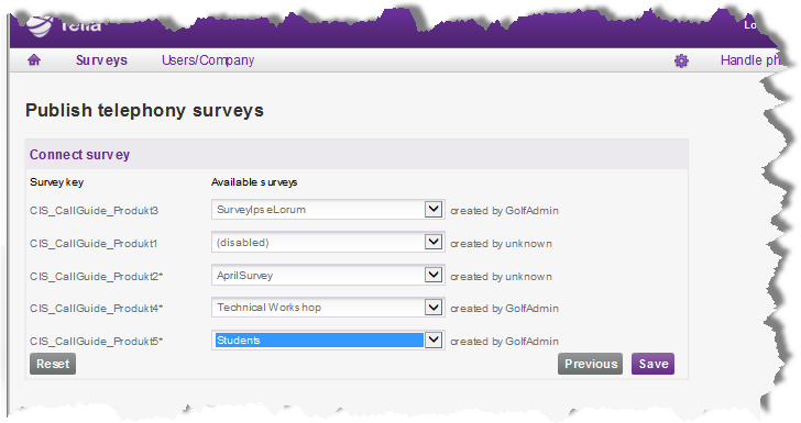Shall the customer answer survey questions online or via the telephone as a phone call or an SMS? The same survey can be published as a web link or automatically made into a phone call or an SMS, directly after the customer contact. Under the Surveys menu choice you see both published and unpublished surveys, with headers and symbols as described in Description of the list under Surveys menu.