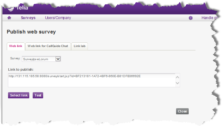 Under Web link, a link is created directly when you have selected the relevant survey from the drop-down menu. This link can be used just as it is. Select and copy as described above.