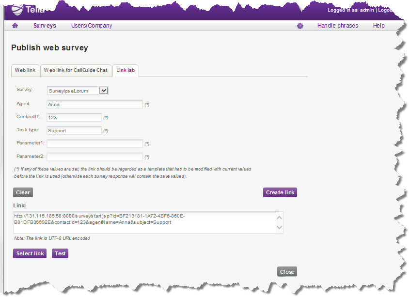 If you have filled in values in the fields described above, the link is to be considered as a template that has to be modified with the relevant values before the link is used, if not, all survey reply will contain the same values.