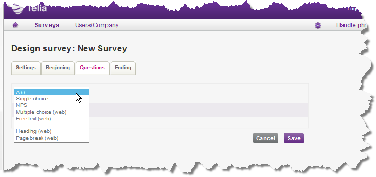 Under the Questions tab you create all kinds of survey questions, for both web and telephony surveys. In addition to different types of questions you can, for web surveys, also add headings and page breaks.