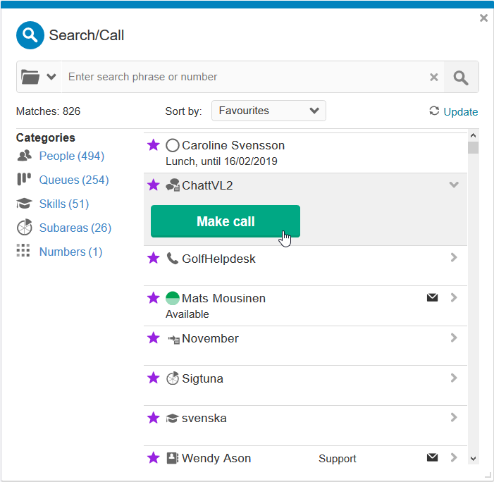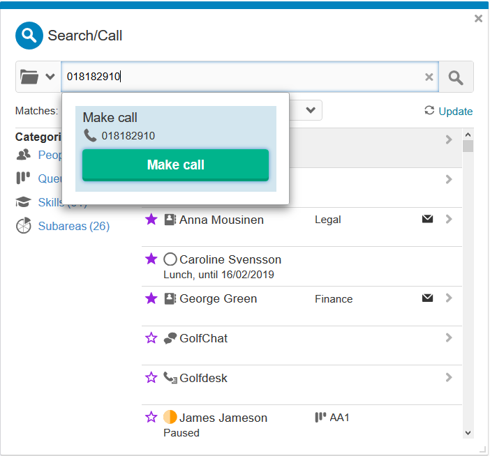 Voit hakea tietyn agentin ja soittaa hänelle tai soittaa ensimmäiselle vapaalle agentille, jolla on tietty taito, joka palvelee tiettyä jonoa tai kuuluu tietylle alueelle.